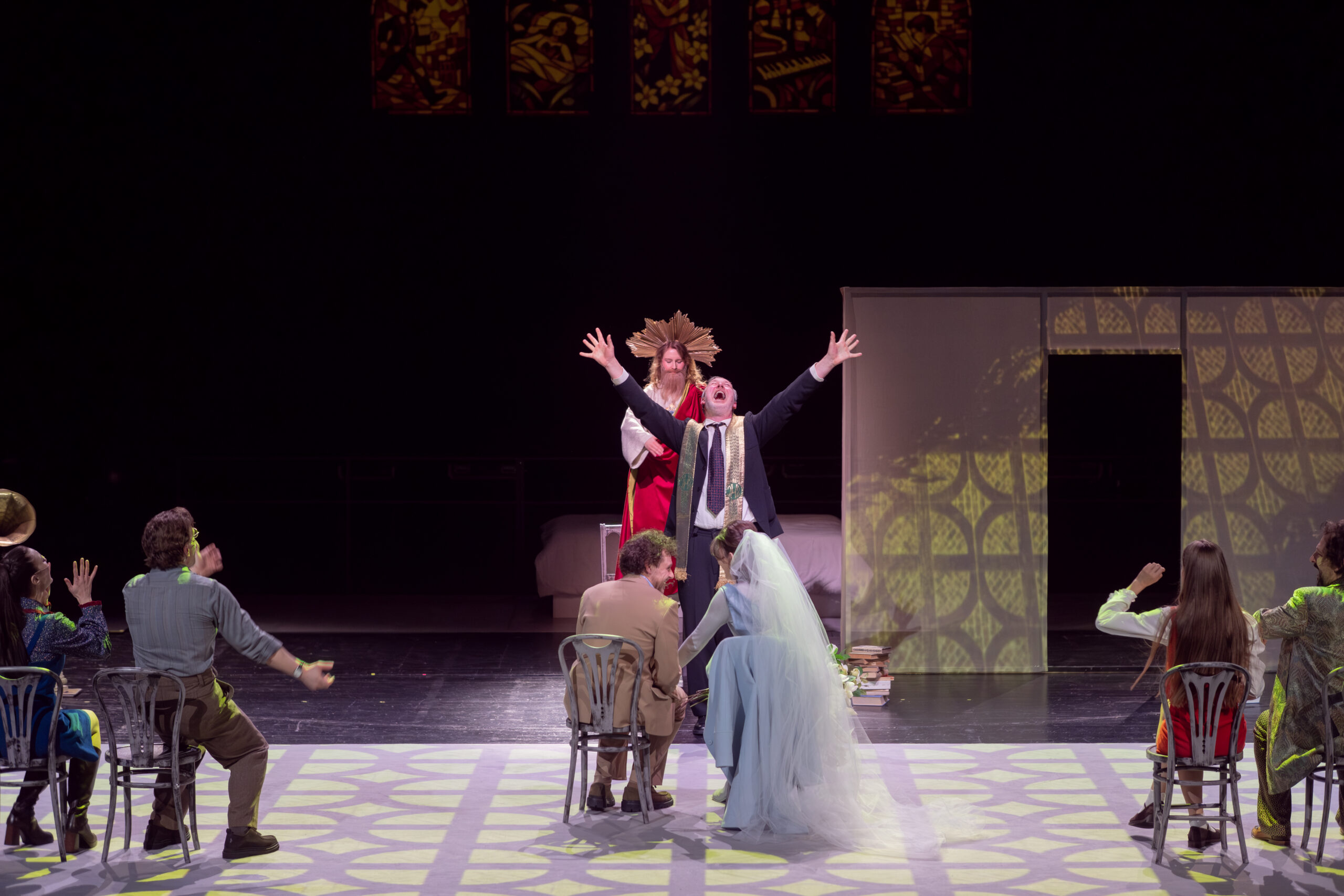 W spektaklu wykorzystywane są fragmenty scenografii z archiwalnych spektakli.